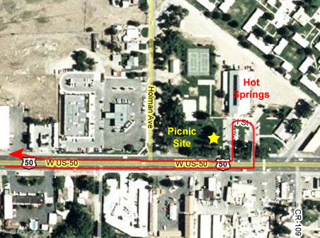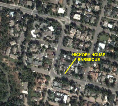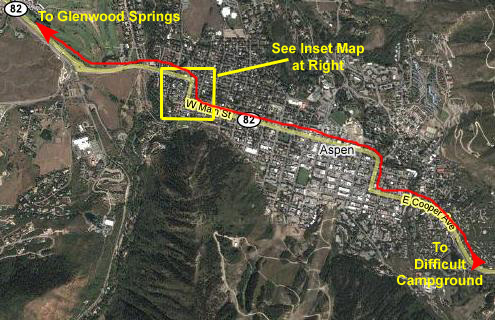 After our hike, we headed back to the campground where we'd set up the tent. When we got there, it was misting and drizzling, so we reluctantly had to give up on the idea of cooking at the campsite and we headed into Aspen. We pretty quickly found that Aspen has done an excellent job of keeping out just about every chain restaurant there is, and the ones that may be there have to abide by all kinds of sign and location restrictions, which made them difficult, if not impossible, to find. We drove all over town, and even a ways out towards Glenwood Springs without finding anything, so we had to return to town and stop at a couple of places to ask. Finally, we got a recommendation for a place we'd passed but missed- no big sign. It was the Hickory House BBQ, and it turned out to be really great. Everything we were looking for, and good, strong and endless iced tea. The aerial views below will show you the Aspen area, the route we traveled through it looking for a place to eat and, in the inset, the Hickory House BBQ.