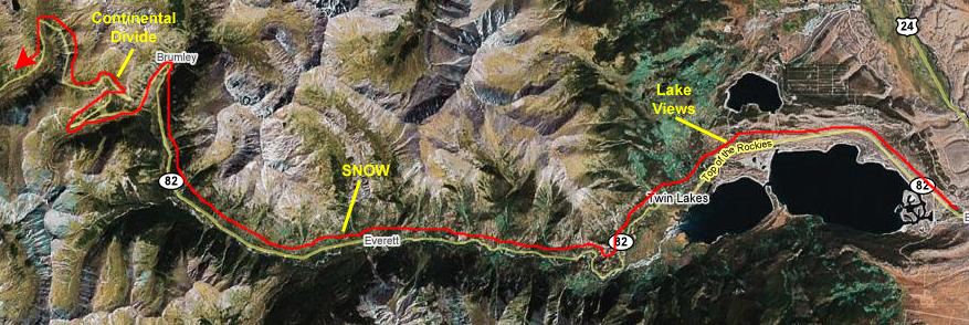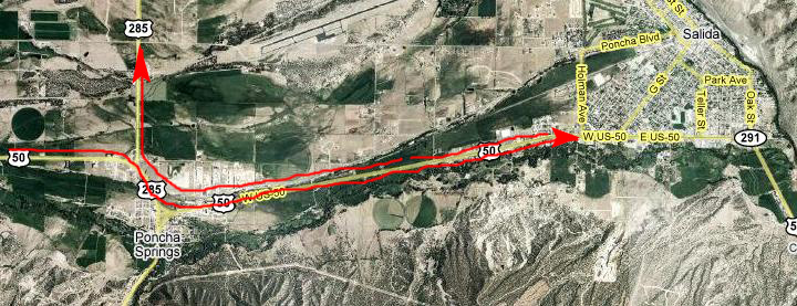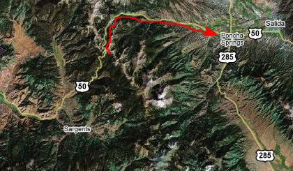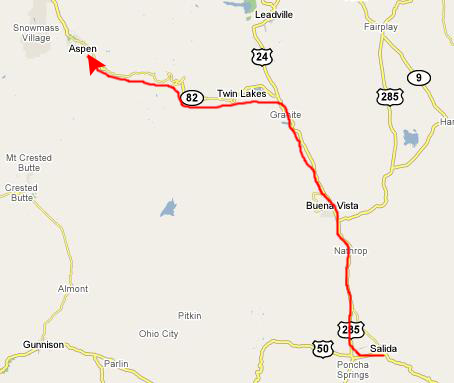 So, what we decided to do was go back through Poncha Springs, take Highway 285 to the point where US 24 branched off, continue north on that, and then take the very scenic Highway 82 over to Aspen. I've marked the route on the map at the left.