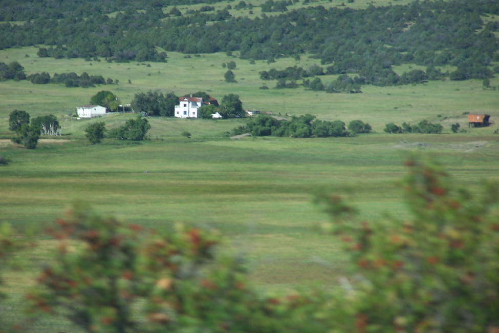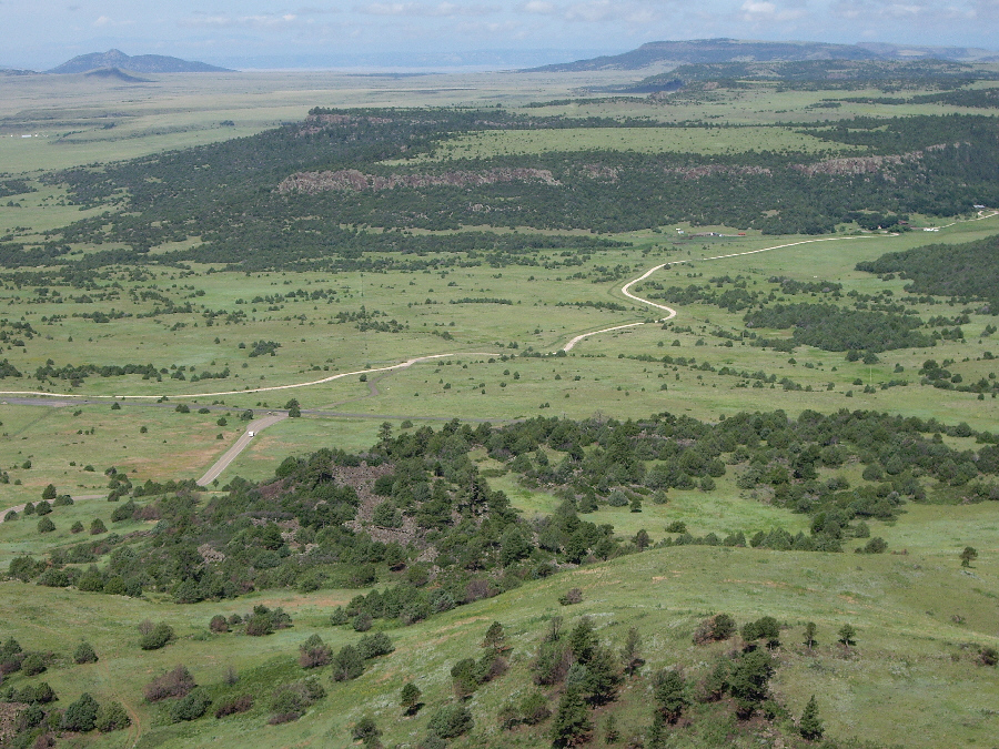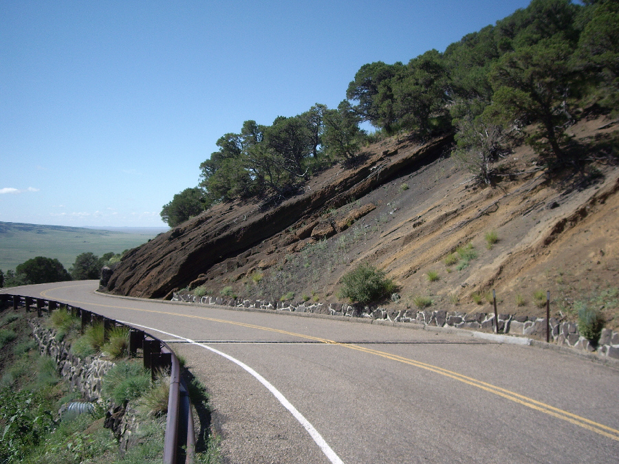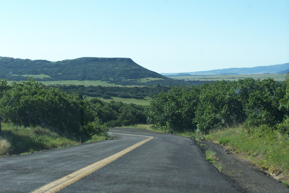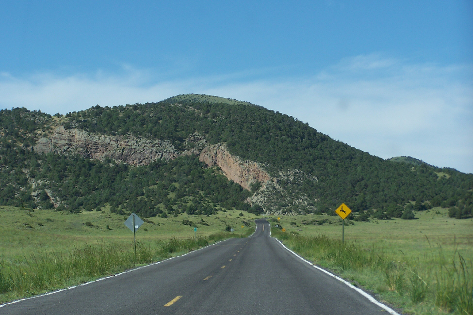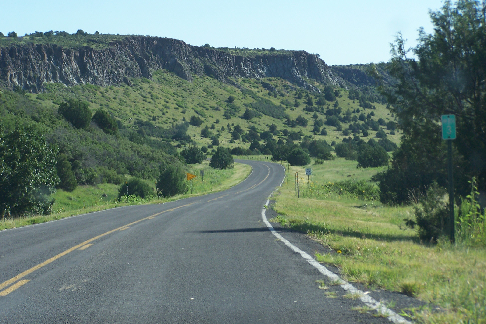 We passed under I-25 and headed east out of Raton. Soon after leaving town, the road started climbing, although it was nothing like the Rockies. Soon, we found ourselves in the high meadow, the entire area being surprisingly green for this time of year. The scenery that we saw as the road wound through the mountains was really beautiful, and this looked like another great place to live if you wanted to be out-of-the-way and self-sufficient. We saw a few good‑sized farms as we drove along with the windows down to let in the cool mountain air. Just before we came down out of the mountains into the flatter valley, the road followed along the base of some beautiful cliffs.