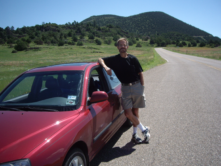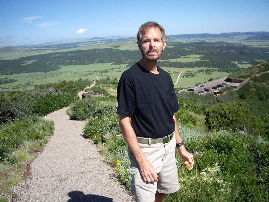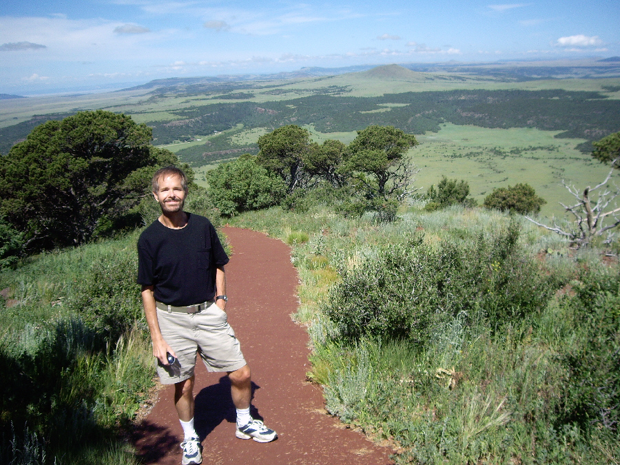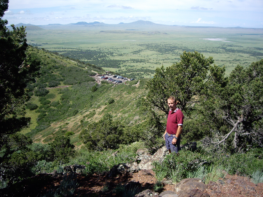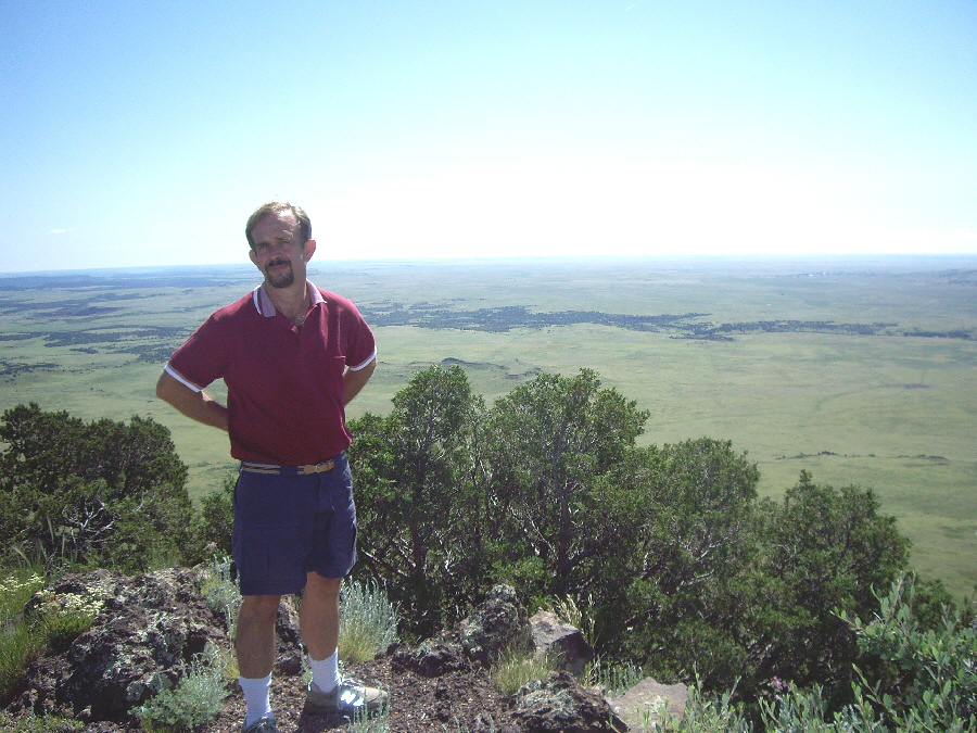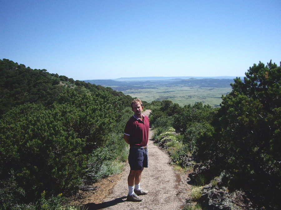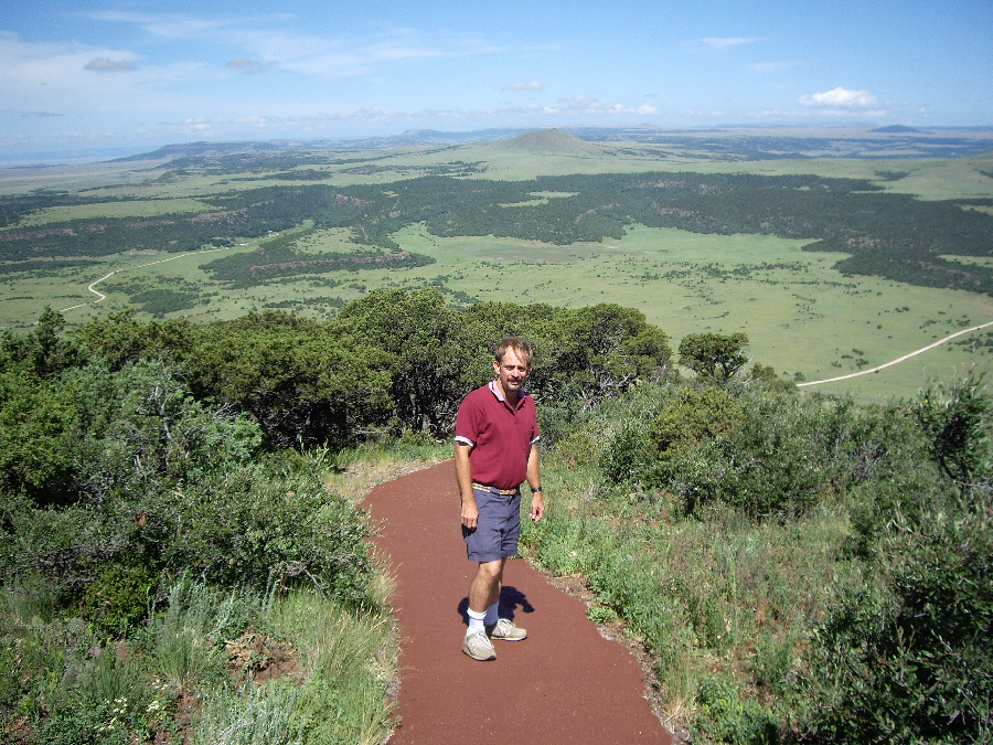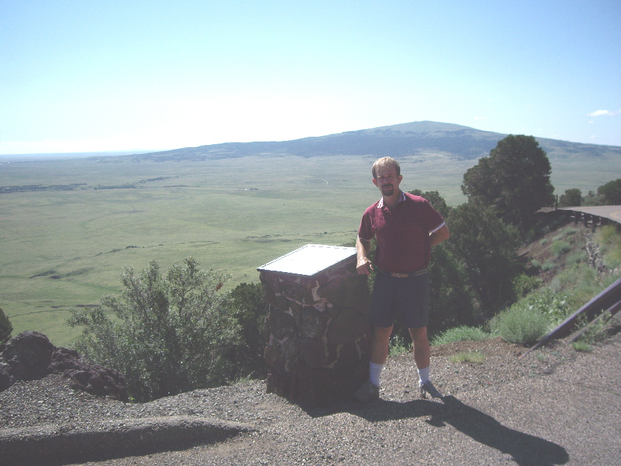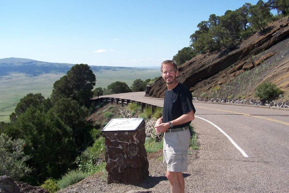 On the way to the top, we stopped at a couple of points to read some of the informative signs and admire the views from the roadway. Here is another picture, looking off in a different direction, of Fred beside the road to the top of Capulin Volcano.