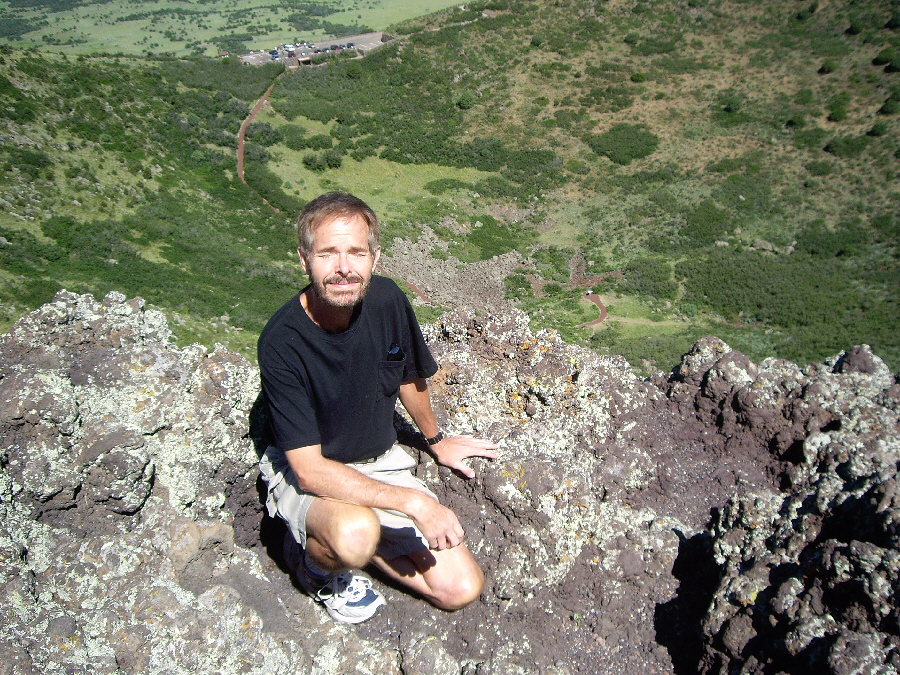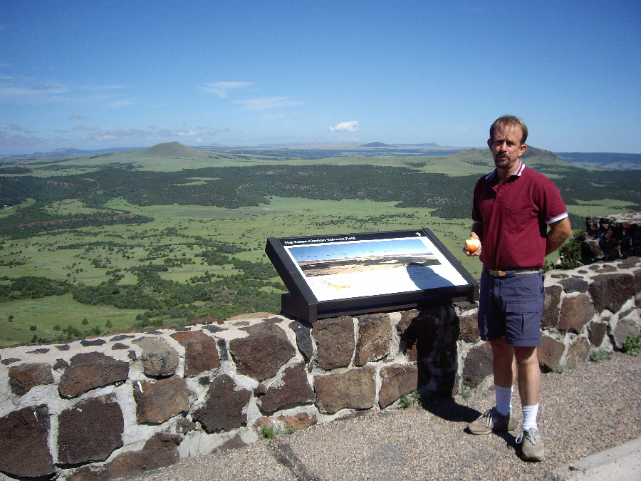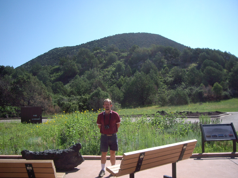We'll be returning to the parking area after a couple of hikes, and I'll show you more pictures of the informative signs and the views from the mountain then, but, for now, take a look at some of the pictures we took when we first got to the top. In the first picture, you can see Fred and the view southwest from the top of the volcano. As you found out in the movie, all those peaks that you can see in the distance were, at one time, active volcanoes (this we learned in the Visitor Center). I can only imagine what the area must have looked like when many of these cones were smoking and spewing out cinders and lava.