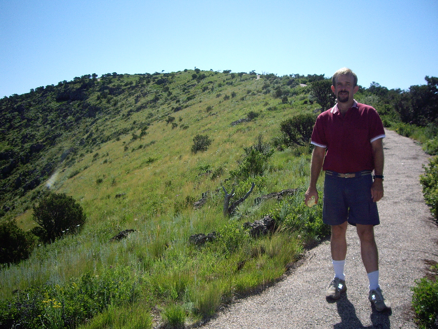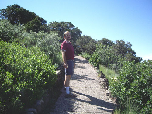 The path had turned southwest, now, and the vistas were really spectacular. Here are a couple of good views, first of Fred on the pathway and then one of me on the pathway. Just as the pathway turned around to the southeast again, a really great view opened up, so I got a really nice picture of Fred with the parking area and the view to the southeast, and you can look at that picture here.