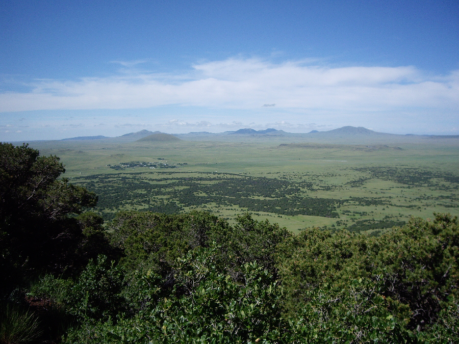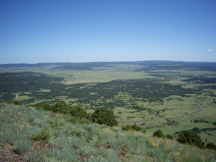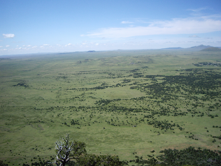Next, the path to the top of the rim turns and heads more northeast and then eventually north. Once you get up that path a ways, you can look back down the path towards the parking area. This would have been a better picture if I'd been warned it was coming. (Incidentally, the battery in Fred's camera had not charged properly overnight, and we didn't know it until we arrived here. So, all of the pictures we took here at Capulin Volcano National Monument were taken with my little camera, either by myself, or by Fred, or, in one case, by some other tourists we met along the path.) Now that we are actually on the rim, the views are spectacular, as evidenced by this view looking northeast.