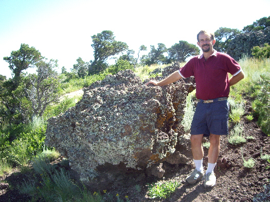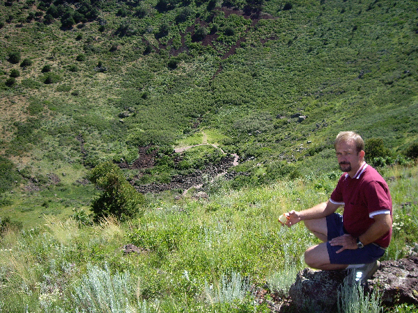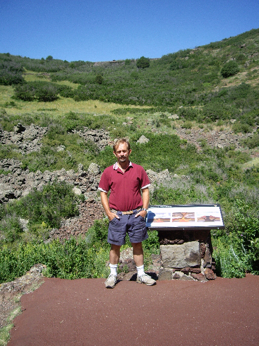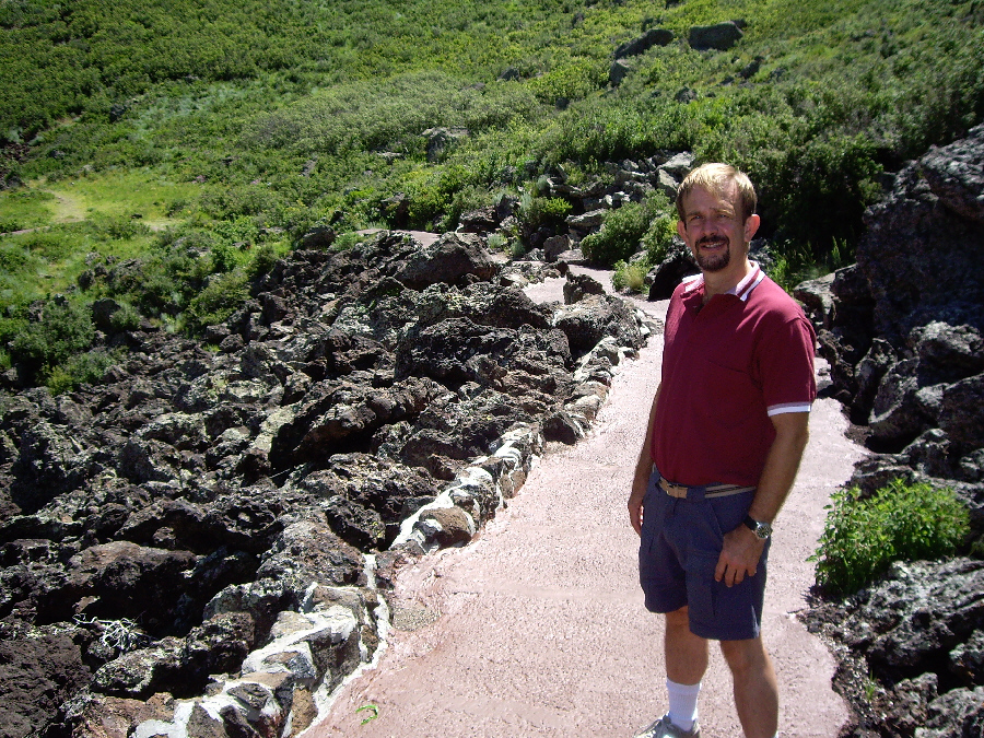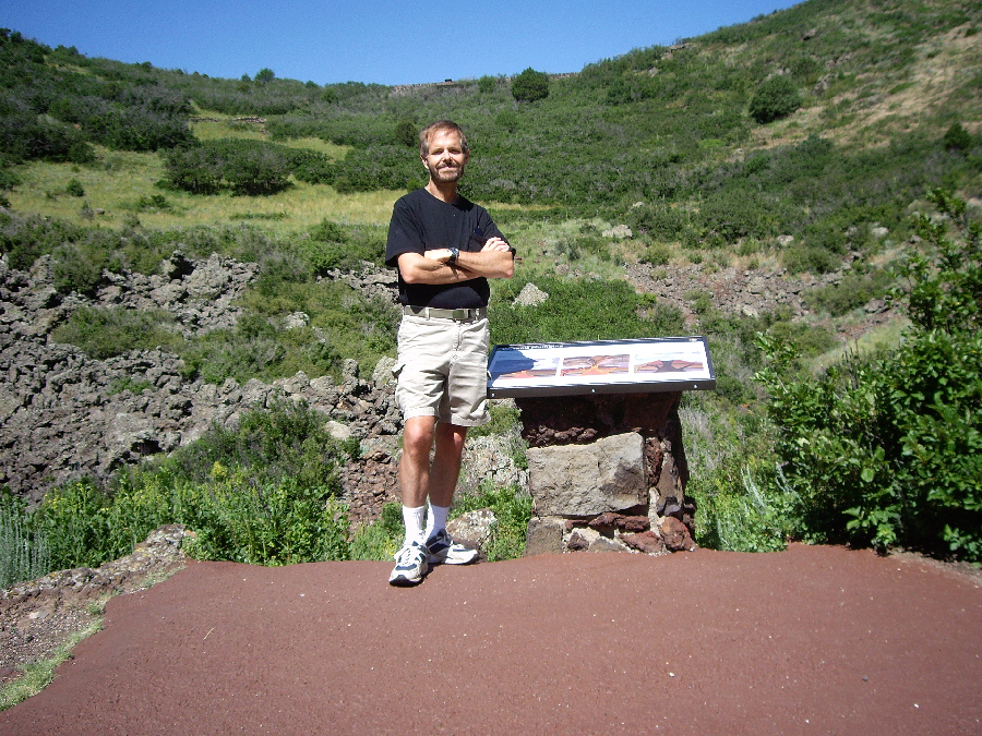 This trail was pretty short, and ended at an informative sign describing "volcanic plumbing", which I think you'll find interesting. From the bottom of the caldera, we had beautiful views up towards the rim; here is a view with Fred and here is a view with me.