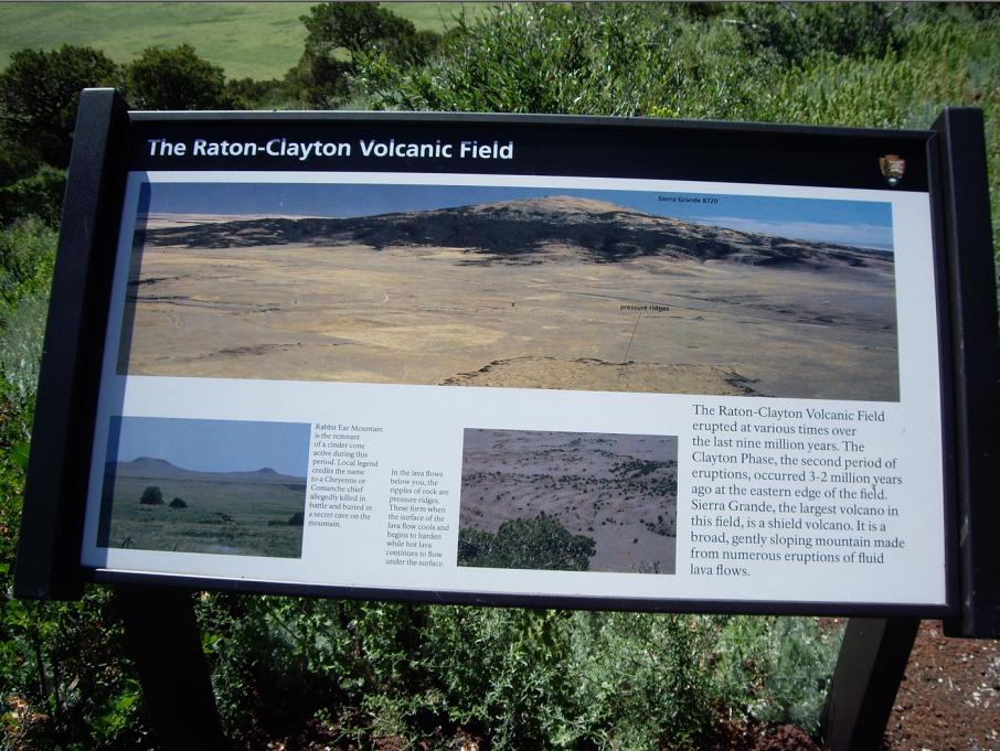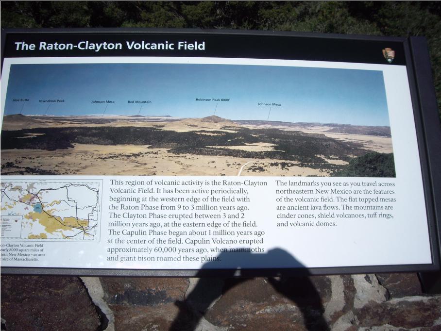 Along the trail, there were two interesting informative signs that described the views in different directions across the Raton-Clayton Volcanic Field. I thought it might be interesting for you to, in effect, look down and read the sign and then look up and see the actual view. So I've paired up these two signs and their views. They are both views of the same volcanic field but looking in different directions. For the first pair, read the sign and then look up at the view. Then, for the second pair, read the sign and then look up at the view. My hope is that for you it will be almost as if you were there taking the walk with us.