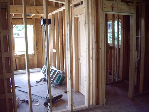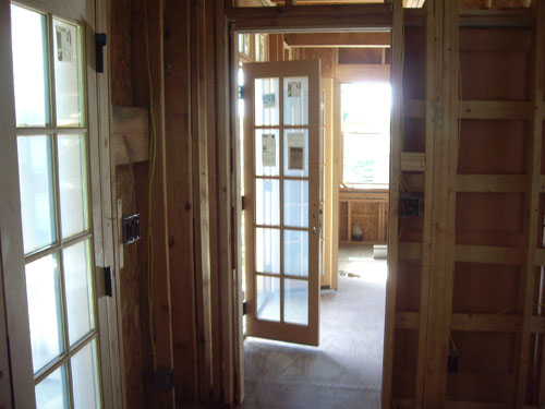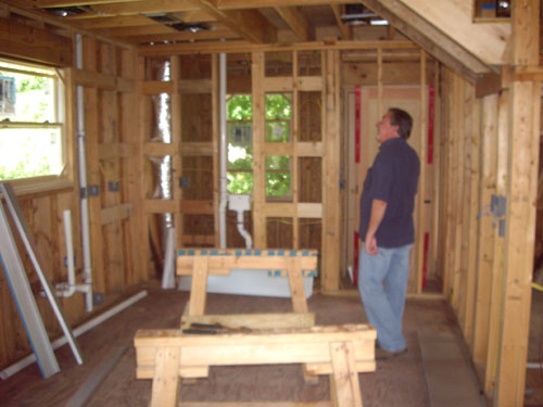 | Looking to the right across the living room to the kitchen, which will have its own door back to the utility room and stairway to the loft. You can see the utility room beyond Ron; the loft is just above him and above the kitchen. |
