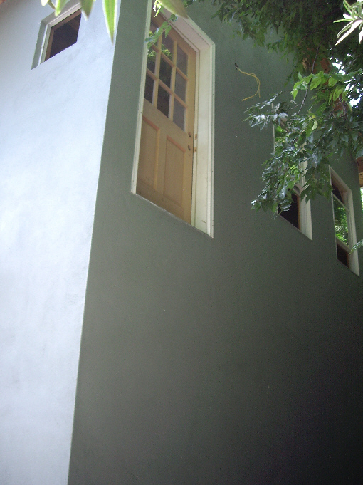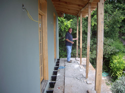 This view looks across the parking area to the back of the main house. At the same time as the garage construction is going on, the Ruckmans are adding balconies off both the French Room and the Luxembourg Room. This will give occupants of those rooms access to the outside (and will make the Luxembourg Room seem larger). In the picture, the kitchen will be below this new balcony; additional supports are being added to hold it up.