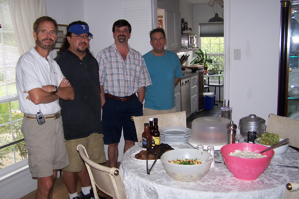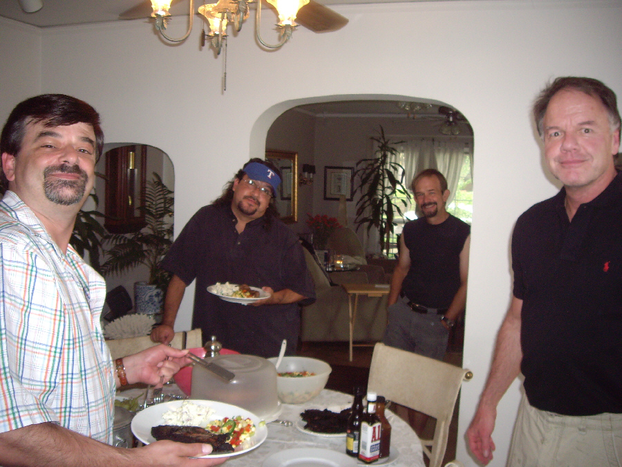 I can't say much specific about the afternoon, except that the conversation was good, Bill was interesting, the food was very good and Lou was an excellent host. Fred and I just took a few random pictures during the afternoon. In the first picture I've included, Lou, Ron, Jay and myself are standing behind the buffet table just prior to serving ourselves; you can look at that picture here. When Lou brought the steaks in from the grill, I took a picture of Ron, Jay, Fred and Bill serving themselves; you can look at that picture here.