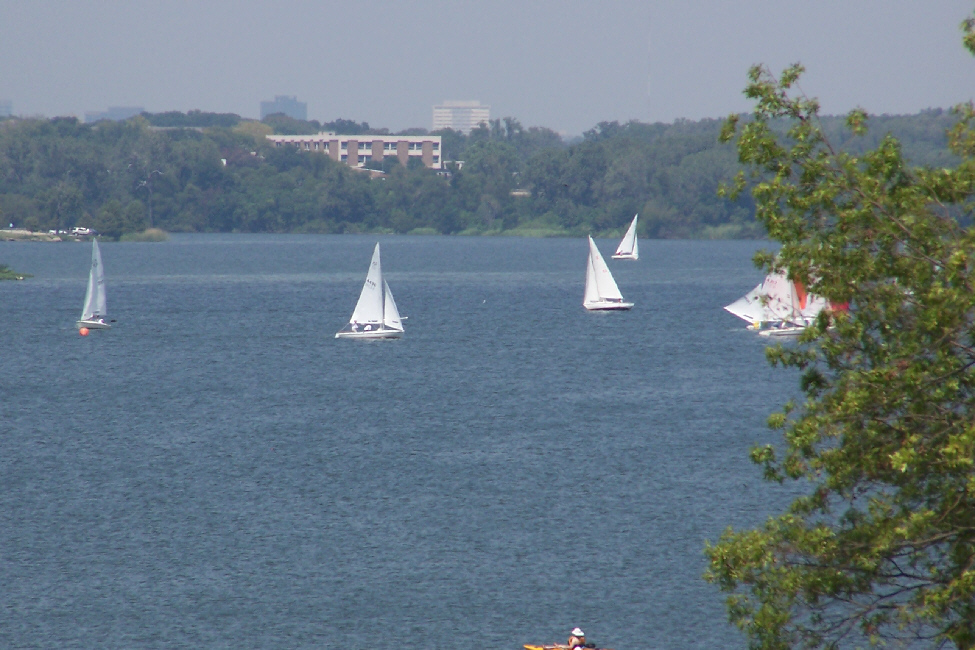Apparently, they walked back to the end of the garden to the waterfalls and then right back to my spot. This is not a time of the year that the gardens are particularly beautiful; most of the flowers have done their due and are wilted from the summer heat. On the way to the back of the garden, Fred caught a view of some of the sailboats on White Rock Lake. When the guys got to the back of the garden, Fred set up his tripod and took a picture of the three of them with one of the permanent animal sculptures in the background. You can see that picture here.