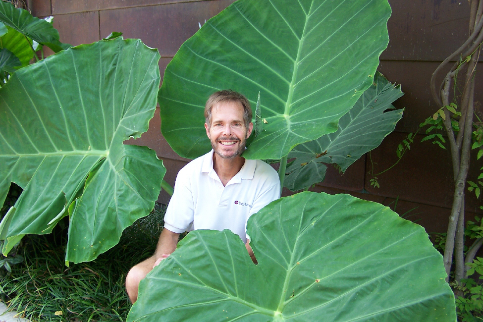 The guys were back in an hour or so, woke me out of a sound sleep, and we headed off to the exits. Along the way, we passed some really, really giant elephant ears. I wanted Fred to try to get a picture of one of the huge leaves spread out behind my head like a Las Vegas showgirl's headgear, but it didn't come out quite right.