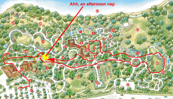 Today is not a major event day at the Arboretum, and so we aren't going to be wandering all through the gardens taking lots and lots of pictures. In fact, as it turned out, I didn't wander through the gardens much at all. But just for your information, I've included below a current map of the Arboretum, and I've marked the general route the other guys took as well as the place where I relaxed in the warm afternoon and took a short nap! Anyway, from this map you can get an idea of the layout of the gardens and have an appreciation for just how far you can wander around. Membership in the Arboretum has been one of the best investments we've made, for it is always a joy to go there.