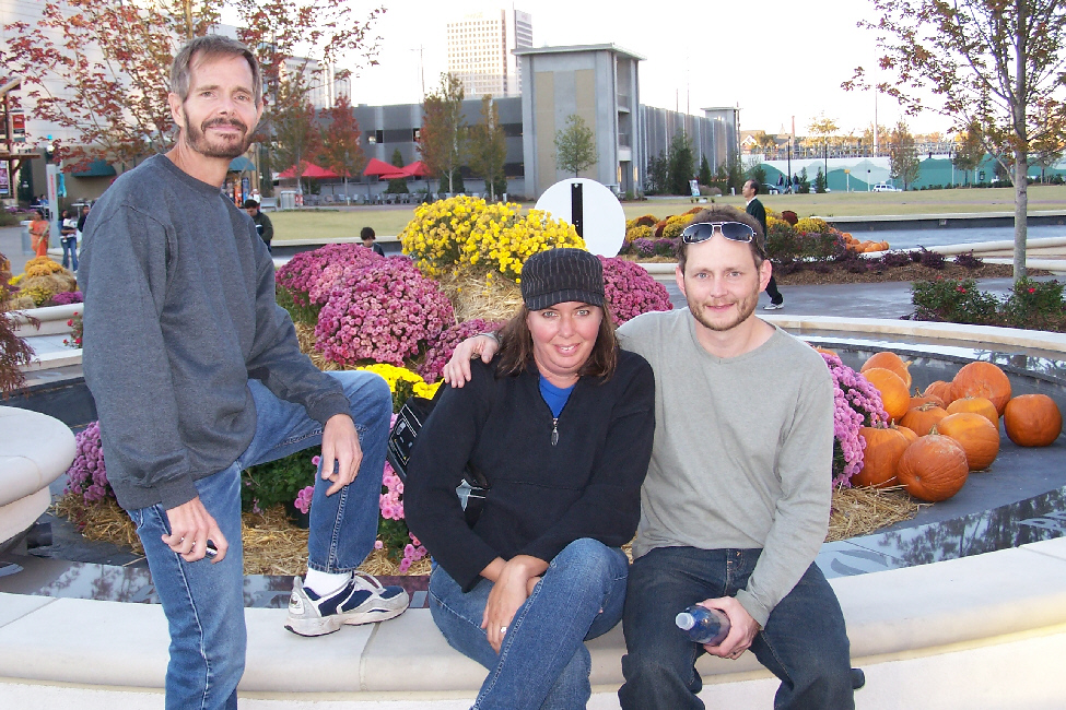 Both Centennial Olympic Park and the area between the Aquarium and the Coke museum have a great many fountains and pools, but none of them were working this afternoon; nor was there any water at all in them. The reason was (and still is at this writing) that the Atlanta area is extremely short of water, due to a prolonged drought throughout the Southeast. In Olympic park, the fountains and water features were simply turned off an emptied; you could walk into them and pick up hundreds of rusted, decomposed coins- all quite worthless. Over here, the fountains have been filled with pumpkins, mums and other Fall color, as this picture of myself, Jeffie and Michael shows.
