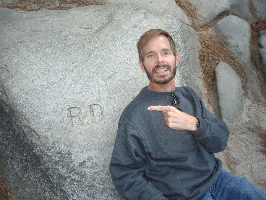 A little ways up the trail, I found that someone had already carved my initials in the rocky floor of the trail, and I couldn't resist having Michael take a picture of me next to it. Actually, I laid down on the rock next to it, as the picture that Fred took of Michael photographing me shows.