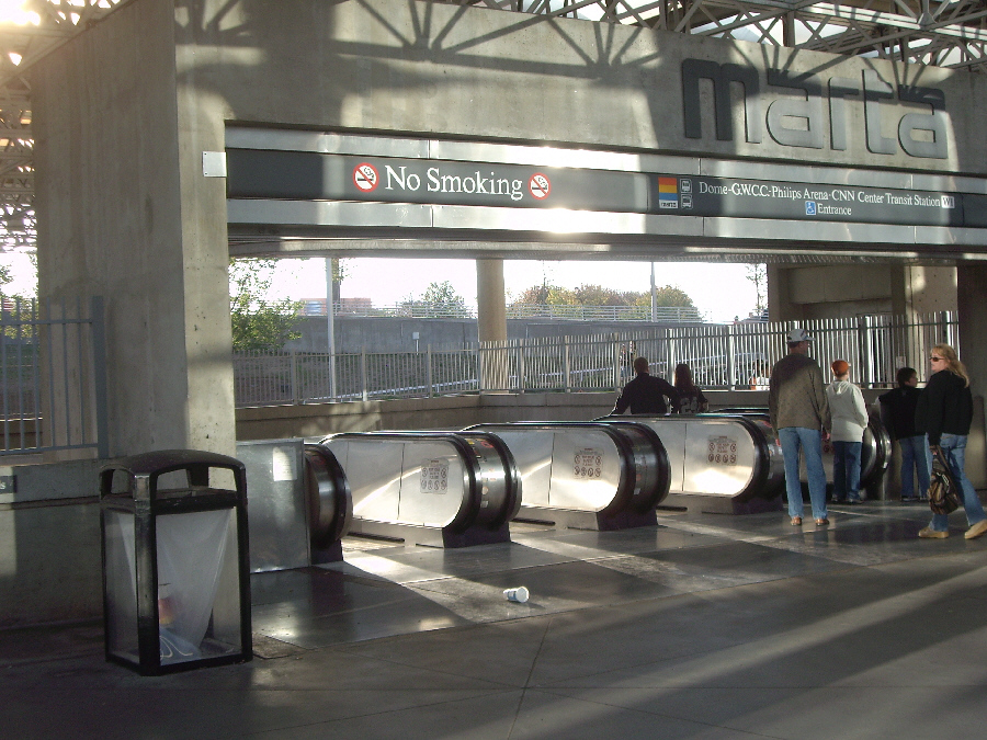 In stark contrast to the Decatur station, the platform for Olympic Park was very crowded. A football game had just ended in the stadium up above the station, and thousands of folks were using MARTA to either get home or get to outlying parking areas. Each train that pulled in had a crowd waiting to board. What with the crowds, it was tough taking pictures, but I did get a fairly decent shot of Fred on the MARTA platform.