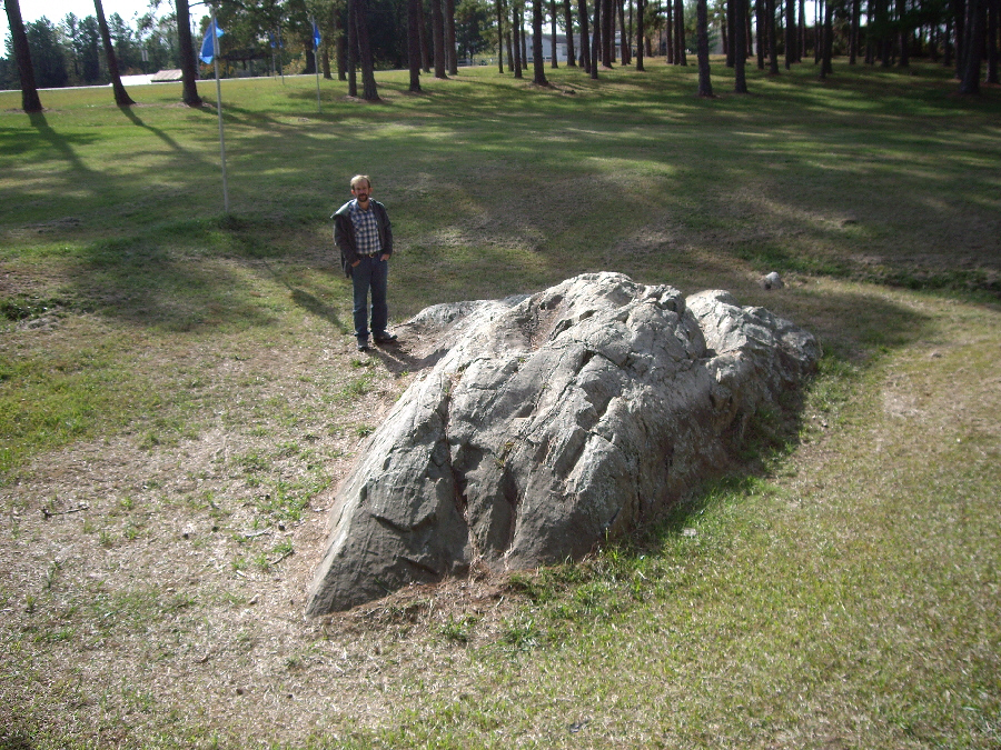 When we finished at the John Allen cabin, we walked out into the battlefield itself to see if we could pick out some of the features that our guide had been talking about. To help us, the park has put up red and blue flags to indicate where the lines of men had been. One prominent feature described in accounts of the time was the big boulder which served as the point where such negotiations as occurred were carried on. Our guide also pointed out that the British regulars were taken aback at the ungentlemanly way that the colonists fought. Instead of forming in neat lines, out in the open, they had the bad form to hide behind trees and such- very unprofessional.