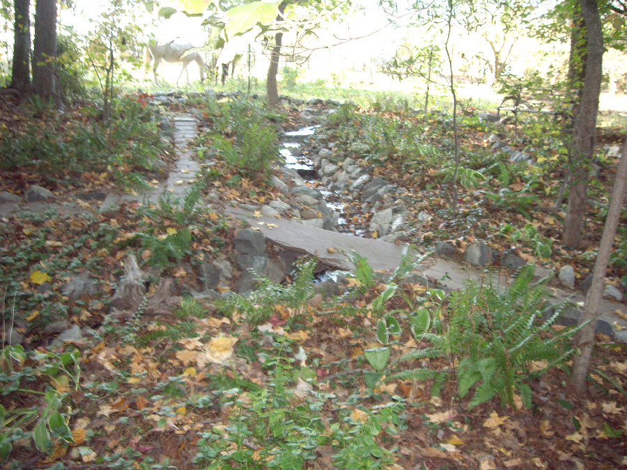 One of the aspects of Judy's farm of which she is justifiably the most proud is the woodland garden that she has constructed in the copse of trees right in front of her house. Some years ago, she got the idea to clean out that area of trees, which had always been just a wild area that served to block the line of sight from the road to the house, giving the house a very secluded feel. When she got it cleaned out, though, she had the idea to try to duplicate the kind of forest trail that she'd hiked locally or in the mountains and, over a couple of years, worked diligently and hard to transform the forest into that kind of environment. Of course she built some trails, and of course she brought into the area many plants from elsewhere on the farm and from outside the farm that would do well in such a shady area. So the paths became more of a nature trail than just a path.