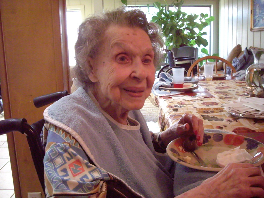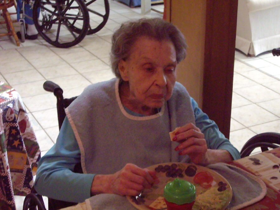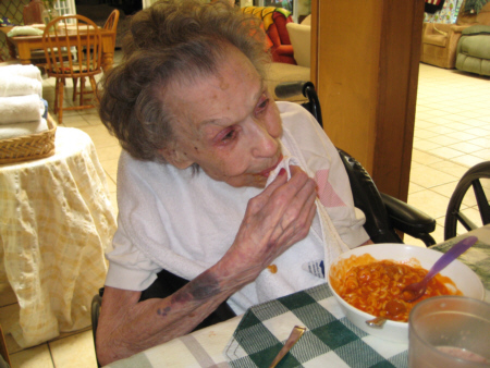 My Mom has gone downhill a great deal in the last year, and one of the times when this is most obvious is when she is eating. She has either forgotten how to sit up straight, or just relaxes and slides over to her right, but unless I straighten her up (which only works for a few minutes), her head is practically sideways when she eats. This makes it difficult to eat anything other than finger food, although for some time now either the caregivers or I have to actually feed her when utensils are required. The other problem, which has become more pronounced in the last few months, is that she zones out when she starts chewing a bit of food, and she will keep chewing until someone tells her to swallow and then take another bit. Now, lately, she doesn't even swallow then, but just keeps chewing, oblivious to the entreaties to stop or to the fact that, eventually, there is no more food left to chew and her teeth are just clicking together.