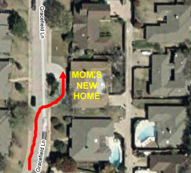 In the aerial view, you can see Mom's house. It is a typical size for the neighborhood; about 2500 square feet, I would guess. It is easy to find the house as it is the only one on the street with a circular drive in front. The house has a living room, kitchen, dining room and inside sunporch where residents may watch TV. Then it has six bedrooms and three baths; one of the bathrooms has been enlarged to accommodate wheelchairs and a larger shower.