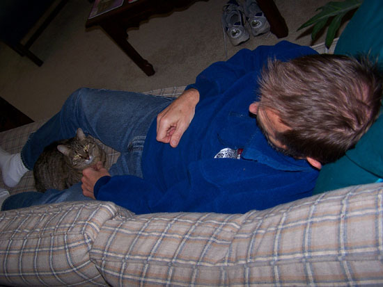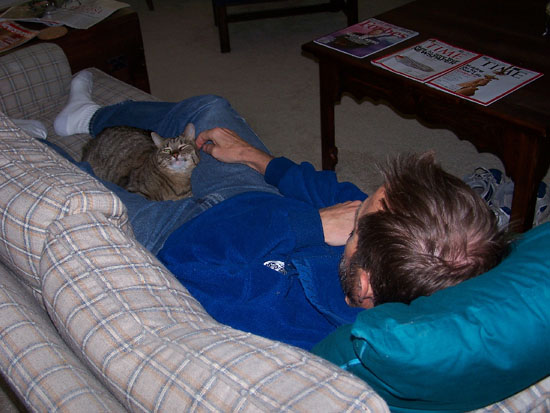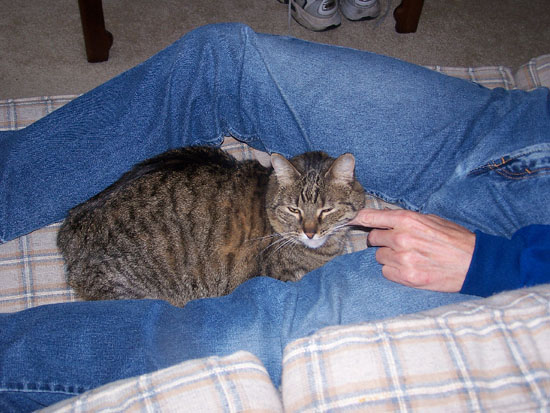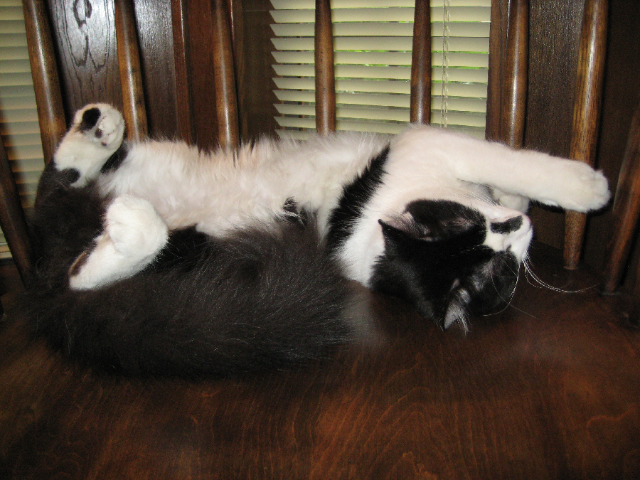 Actually, we have two unsuspecting cats here; this picture is unusual in that Bobbie Lee and Lucky are rarely so quiet and so close to each other. This relationship, too, has been improving, and while Lucky still harasses her occasionally, he is just as likely to walk right by her, and she him, without any reaction to speak of.