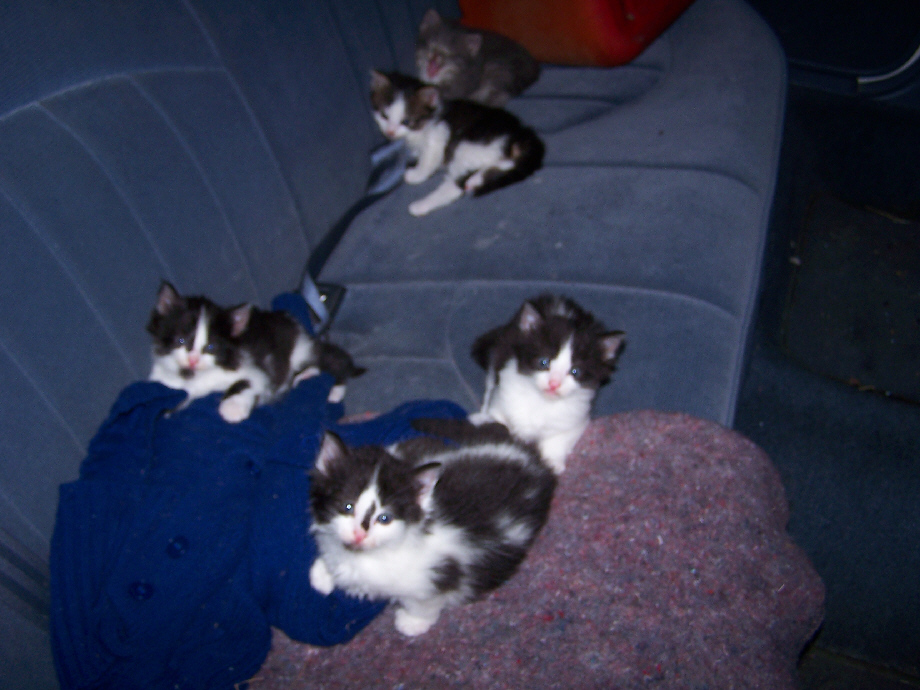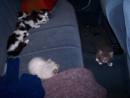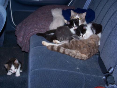 Fred did not come back to Dallas until the next day, but before he left, he took a couple of other pictures of the kitten and its siblings and their mother. He took these pictures when the cats were in their temporary home inside Mom's vehicle. The mother cat is at the left here: