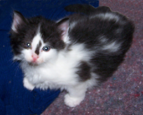 were "tuxedo cats," a term used to describe mottled black-and-white cats, but the kitten Fred had his eye on was a bit different from all the rest. He had a black spot on the top of his nose, and another black spot underneath his chin. One eye was in a patch of white fur, the other in a patch of black. And he seemed at least as friendly as any of the other cats.