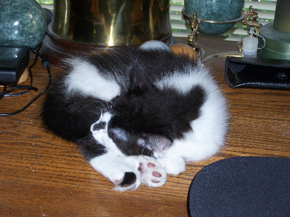 Fred is here this Sunday, as usual, and, also as usual, he is doing some surfing on the Internet. Not wanting to be left out, Lucky has, again as usual, gotten up on the desk and laid down to keep him company. Unfortunately, the spot he has chosen is right on top of the mouse pad, making it difficult for Fred to do his surfing.