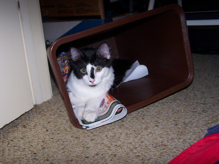 Lucky can usually be counted on to be right where we are. Today we're working in the den, and Lucky spent an hour lying next to the scanner watching me. Then he got bored and went to play in the trash can in the closet. Fred got pictures of him in both places. Click on the two pictures below to see the full-size images: