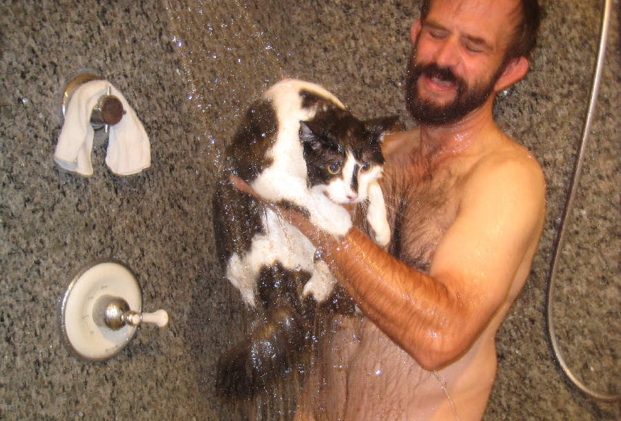 Today, Fred is planning on showing me how he gives Lucky a bath. He's been doing so every other month or so since Lucky was a kitten, trying to get him acclimatized to being bathed. It has worked well, Fred tells me, in that Lucky doesn't seem to mind much getting into the tub or shower with him and getting shampooed. But today is the first time I'll have a look at the process.