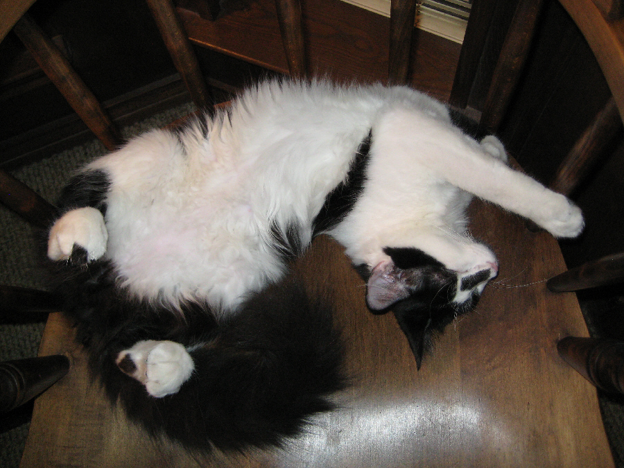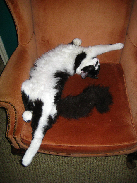 Today, as I am often doing, I am working on one of the computers, and Lucky is asleep in one of the wing chairs behind me. I am constantly amazed how he can sleep in the positions he assumes. It seems to me that while most cats, including Bobbie Lee, curl up when they are asleep, Lucky sprawls, often upside down with his feet in the air, on chairs or the floor. The positions he assumes are a source of constant amusement, and today I've taken a few pictures of him.