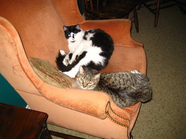 Times during the year when they were together but not chasing each other were rare, and one of them occurred today, when both Fred and I were in the den. Both cats came in and, in an unusual move, got up on the same chair. Fred thought that unusual enough that should take a picture, and the photo of the two of them is at the left.