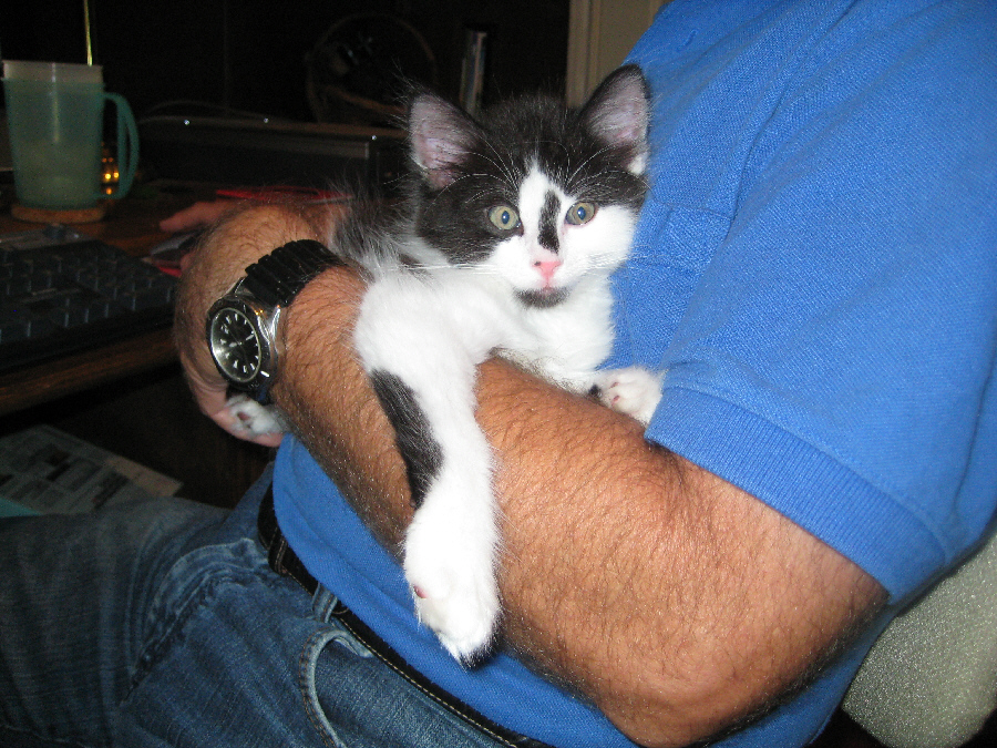 Right after we gave the new kitten a bath, we sat down to let it dry off and to play with it a bit. The first thing we did was to make a movie of the new kitty, in which Fred gives a bit of its history and during which the kitten gets his name. |