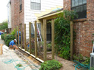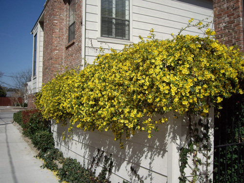 I have been postponing rebuilding the patio wall, the one that my Carolina Jasmine has been so happy on, and the one you can see in the picture at left, which was taken in 2006. I knew that it would be a real job. Not only did the fence have to be entirely rebuilt due to the fact that some of the posts had rotted so much that you could move the whole fence with just one hand, but the gate had to be remounted as well, since it is very hard to close now due to the shifting of the fence. This meant that I would have to either uproot and discard the jasmine, or somehow taken it down off the fence and lay it in the patio while the rebuilding went on. I didn't want to the former (you can see that the Spring color is really spectacular), and I knew the latter would be difficult- both for me and for the jasmine.