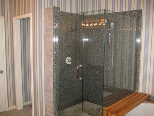 Following the suggestion of one of the designers, the door to the shower will be moved to the right side and will no longer open out into the room. On the right side of the shower a raised platform will be built, and it will be topped with some of the granite that is removed from the walls. Inside the shower, both showerheads will be moved to the back wall, and an inside-shower bench seat will be built on the wall where the water control is now. This bench will be topped with more of the excess granite.