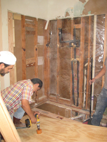 At the moment, in the picture at left, they are preparing some of the plywood that will cover the studs in the wall, cutting holes for the various plumbing fixtures. They will be doing the same thing for the subfloor underneath the shower. There will be insulation in the walls to replace the insulation that had gotten damp. The plastic will also act as another vapor barrier to protect the insulation in the future.