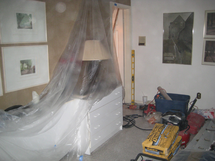My bedroom is a mess, but I am not using it in the interim, but just using the guest room. All the supplies the crew is using, as well as anything we removed that will eventually be reused is being stored there. All my furniture as well as the carpet have been covered by plastic to keep as much dust out as possible. I took a couple of pictures of the current condition of my bedroom, and you can have a look at them