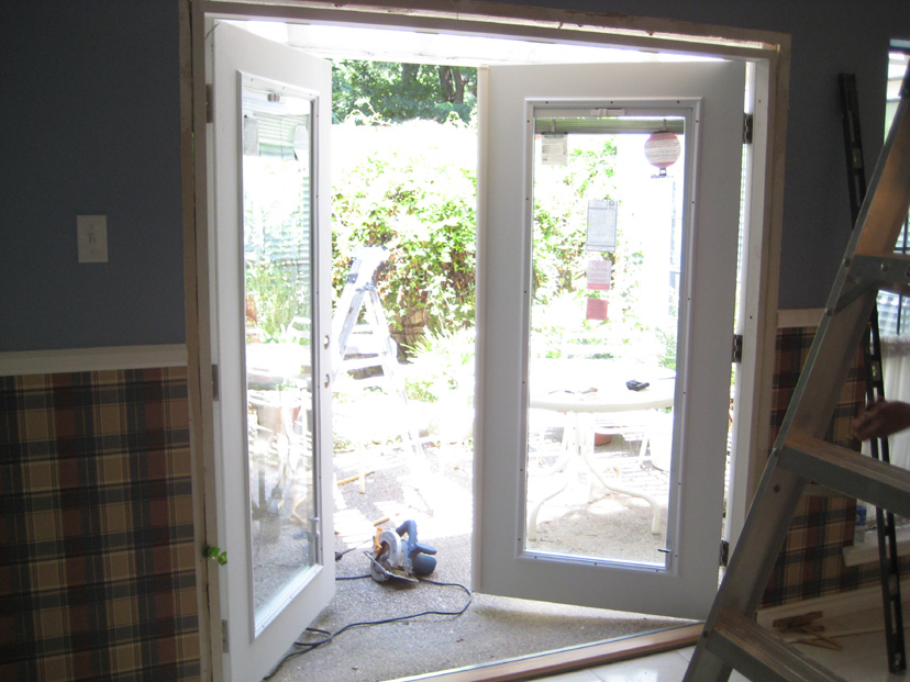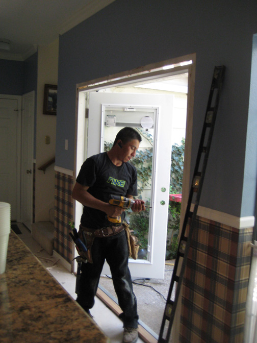 Today, though, the new double French doors that Jack had built are being installed. You can see one of the crew securing the framing to the kitchen walls