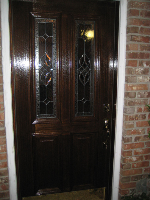 Since we were redoing the entry walls, this was a good time for me to get something else that I have wanted for a long time- a new front door. My current one stuck a lot and looked terrible. It was either plane it down and repaint, or get and entirely new one. The cost of a new one, a richer-looking wood and glass door, was only a bit more than fixing the old one, so that's what we decided to do.