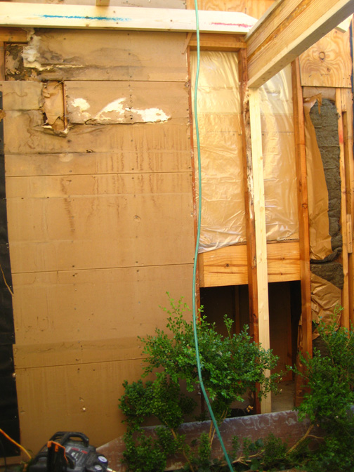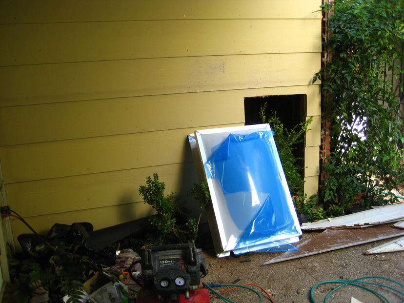 The north wall of the patio, showing the new support stud for the roof beam that has been installed in the wall there. Some of siding has been removed, but basically just where they need to work on the new roof and the area underneath it. The windows have not yet been replaced, although they have been ordered.