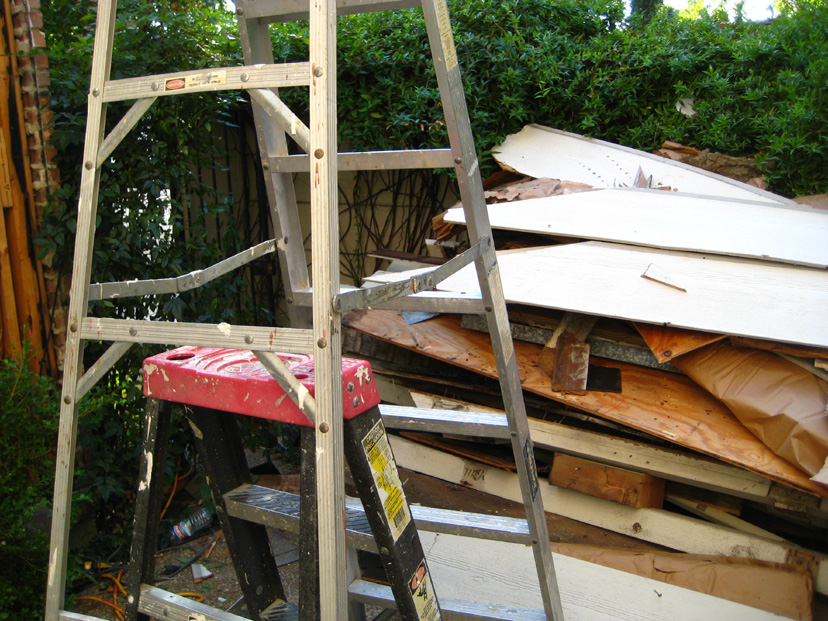 Jack has arranged for another dumpster to be delivered, but it is not here yet, so they have had to pile all the latticework, the original patio beams and the damaged siding here, inside the patio. As you can see, the fence has not been taken down yet, so the jasmine is still up. This was taken mid-morning on the first day of work.