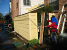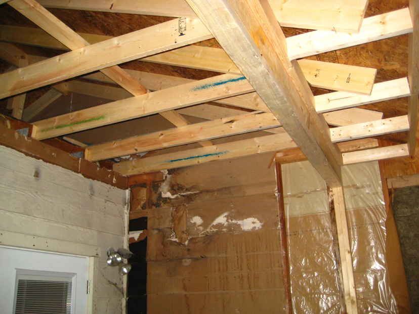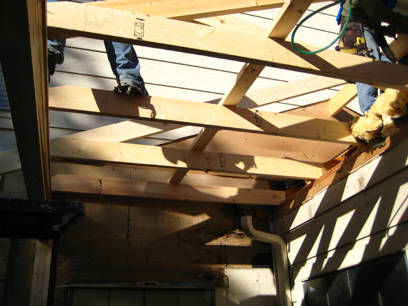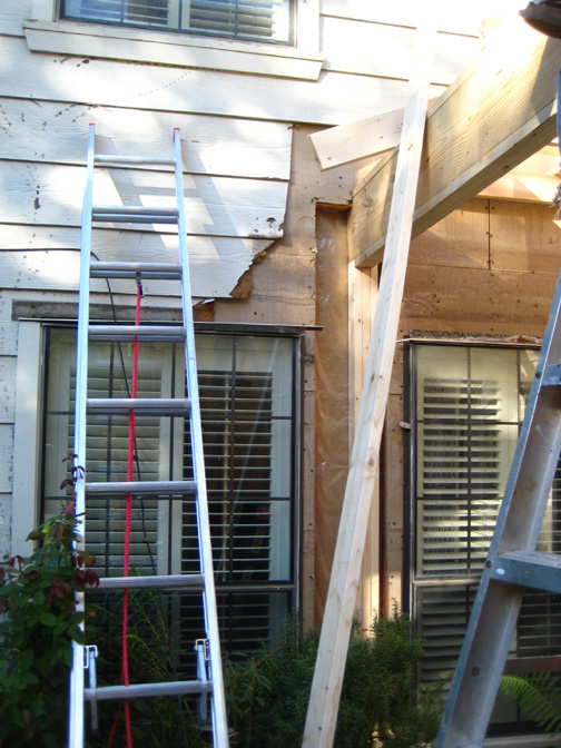 Here we see that the damaged boards in the upper corner of the garage wall have been removed and the new siding installed. (It will all be painted, of course, to match the existing color of the house>) You can also see the underside of the new roof before it is closed in.