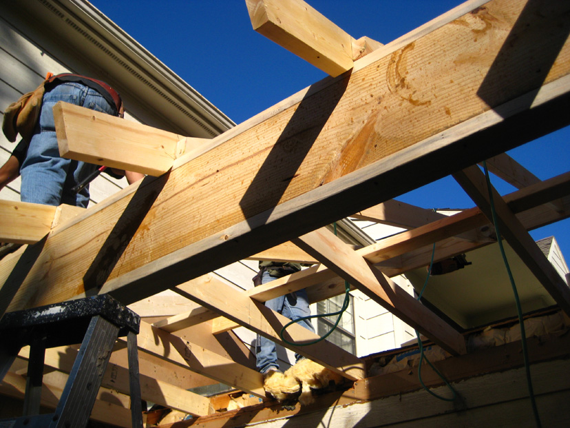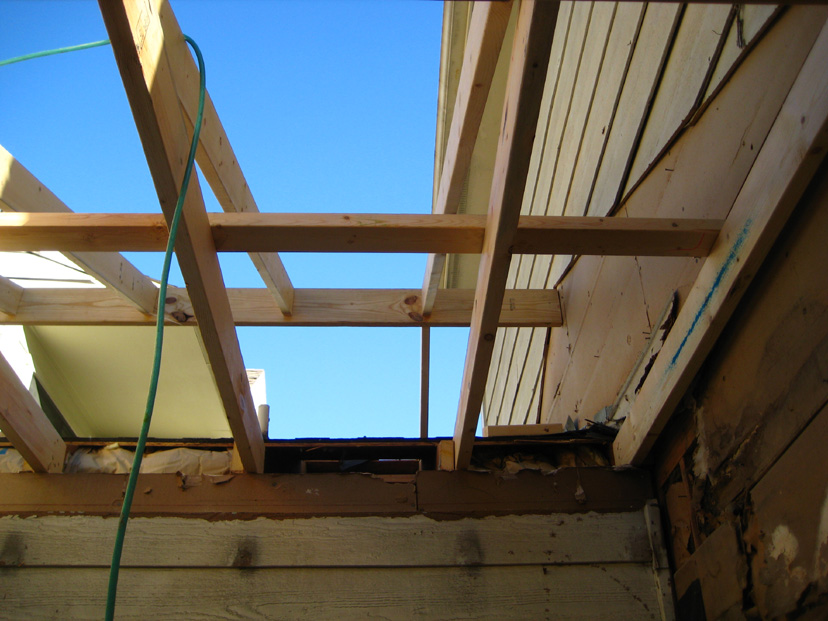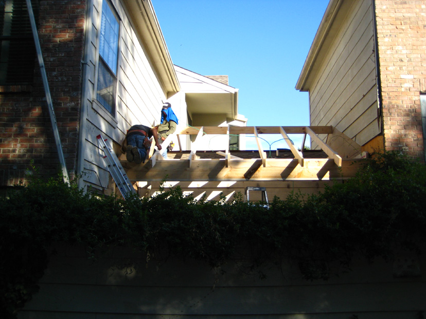 Looking towards the living room again, the workers are finishing the framing for the new roof. The trellis used to have an opening along the living room wall to allow a downspout to carry water from the gutter that was there originally. The gutter will be much further out, now, and that area totally sealed. I believe Jack is going to reuse that downspout when he moves it further out. It is interesting that they know just where the studs in the living room wall are; they have attached the roof beams to them.