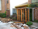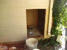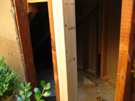 This is the south side of the patio. The damaged boards have been removed, and some of the supports for the new roof added. The water damage in the upper left was caused a few years ago when the flashing on the existing roof developed a leak, and I got water coming into the kitchen just by the back stairway. The flashing was repaired, but you can see that there was some damage behind the siding. This will be repaired before the new siding is put on. The space under the stairs has been opened up, and we've decided to make a small storage room out of it, accessible through a locking door that will open out onto the patio.
