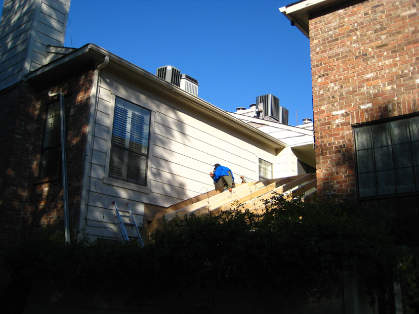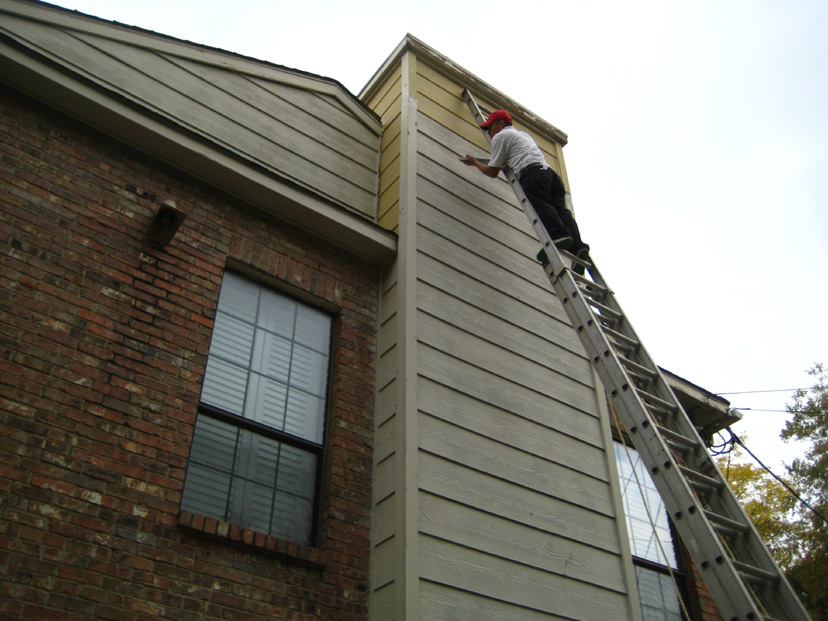 Here is yet another crew member working on the deteriorated siding near the top of the family room chimney enclosure. They did an excellent job of finding all the place where repairs were needed.