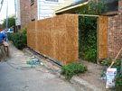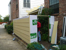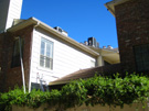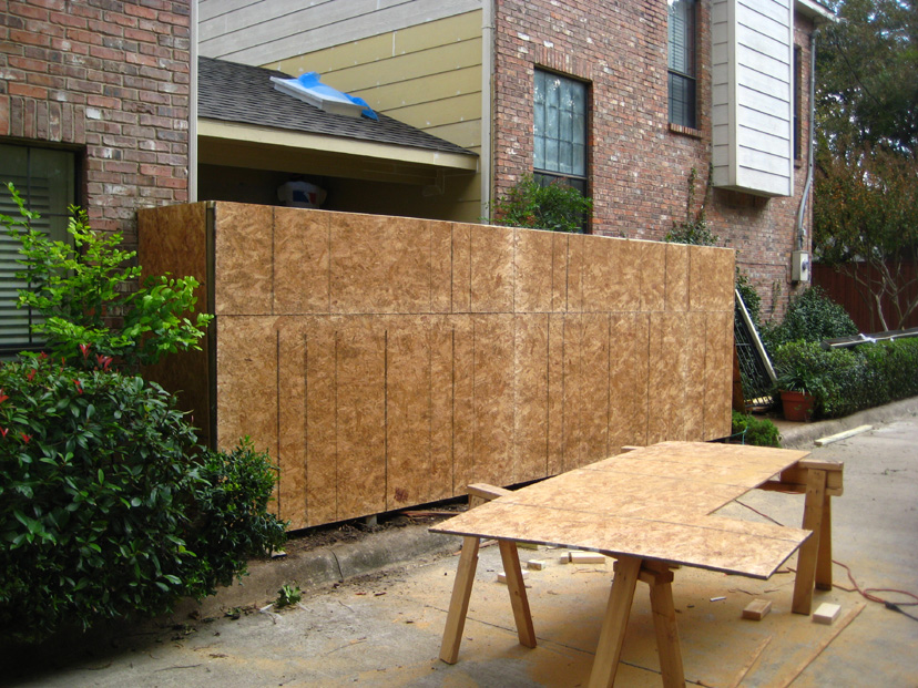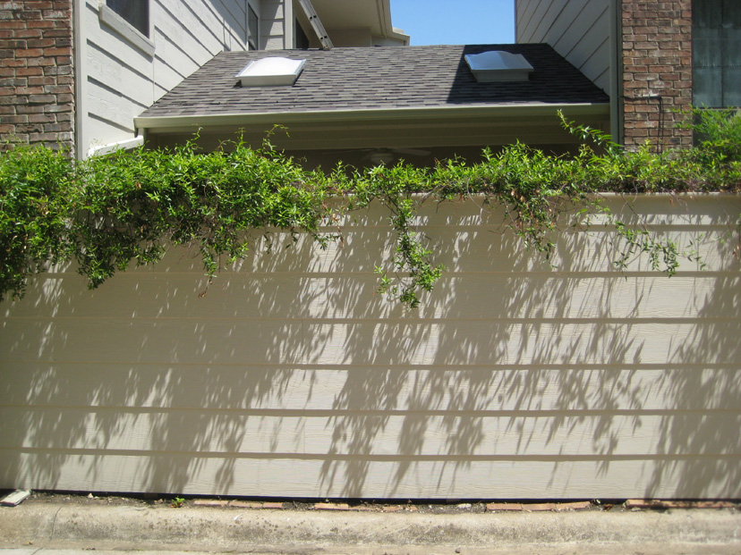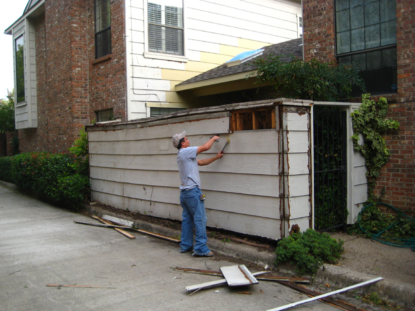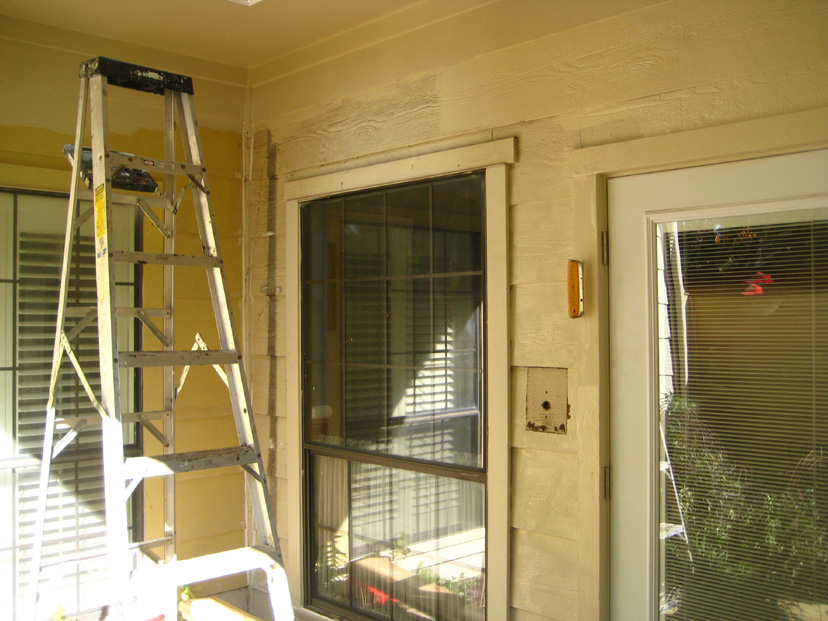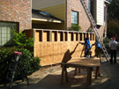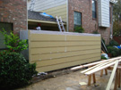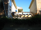 We discussed two further issues as well. The windows from the living room and upstairs bedroom that look out onto or down onto the patio had lost their seals years ago, and now there was always condensation in the interior of the windows. We decided to replace all three of them. Finally, due to the fact that I was not conscientious about keeping climbing vines and ivy from crawling up the walls, many of the boards around the patio had warped due to the pressure of vines growing behind them, and many of the boards still had the stickers from where I had pulled the vines down over the years. It wasn't worth sanding and repainting the boards, so we decided to replace them with the newer "Hardy Board" product- the same product that would be used on the fence. Since we would be doing that, it made sense to have Jack's people replace the boards around the rest of the outside of the townhouse that had deteriorated over the years.