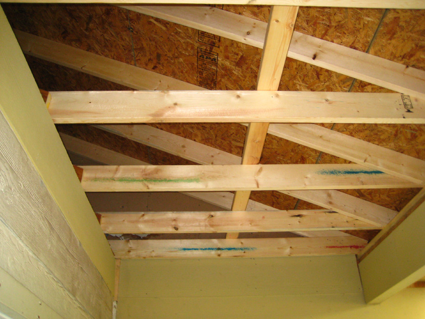 In this picture, you can see that the new boards are up along the garage wall, and the stud has been cut from the opening where the door to the new little storage area will be installed. You can also see one of the skylights that is going to be installed on the roof.