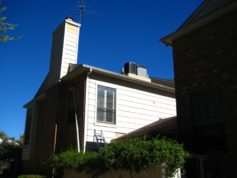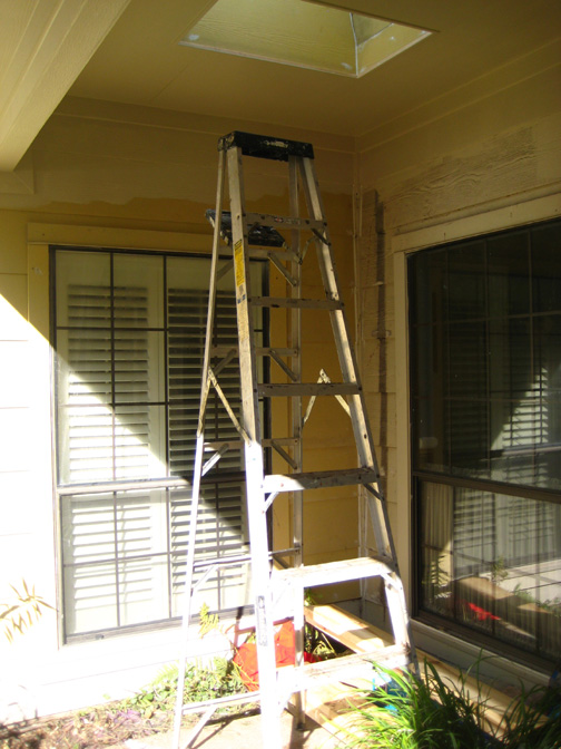 Here is a picture of the wall with the new patio roof and skylights in the background. My neighbor is having his own chimney enclosure rebuilt today, and his workmen are using my patio roof as a stepping stone to get up on the high roof. I told them to go ahead since their ladder wasn't tall enough to reach all the way to their roof from their patio.