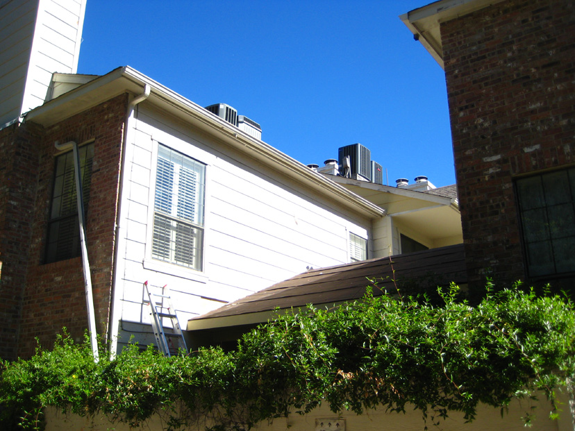 And here is a shot of the patio roof. It is pretty much complete, except for the skylight installation. Jack wants to be here for that, since there had been a problem with the skylights that were ordered. They won't be installed for another week or so. You can also see that I had the boards replaced on the side of the roof of the unit next to mine. They were falling down, and water was going to be getting in, so, even though I'll have to eventually seek reimbursement from my neighbor, I wanted to go ahead and do it to ensure that no water damage would get started. (I've asked Jack to break out the cost of that bit of work so that the next time the townhomes do siding repair and repainting, I can get my reimbursement- since that wall is part of my neighbor's unit.