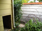 This picture looks in to the patio through the gate, which has now been reinstalled. You can see that the trim is a little different than it used to be, but it looks much better. In the background you can see one of the new windows on that side- the upper one in the master bedroom.