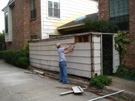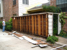 Now they are removing the inside boards. You can see how rotted the top of the fence is; in places it is just falling apart as they take off the siding. In between pictures, I am helping them get the dead vines out of the way, and haul off the debris to the dumpster which is again parked behind my garage.