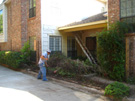 There. The entire fence is gone, save for one post near the garage that they have left as a starting point for measuring the position of the new posts. Now you can get a better view of the Carolina Jasmine laying forlornly inside the patio. If you are wondering about that cable dangling in front of the living room window, that is my television cable. When we had the switchover last February, I got cable for the first time, and they had to run it all the way from the back corner of the garage to the attic to connect up with the house cable system. It had snaked along the garage wall, around the corner into the patio, up along one of the old trellis beams, and then along the side of the front of the house and up by the downspout to enter the attic under the eaves. It, too, is laying in the patio; when they are done, it will go across the top of the new roof where it can't be seen.